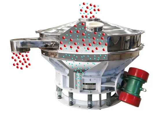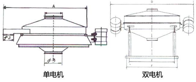 直排篩的作用原理是振動電機(jī)軸上下端的兩組偏心塊(不平衡偏心塊),將振動電機(jī)的旋轉(zhuǎn)運(yùn)動變?yōu)樗健⒋怪薄A斜以及離心作用的多作用力重疊,再將這種作用力傳遞給篩面。改變上下偏心塊的相位角和可以改變激振力的大小和物料的運(yùn)動軌跡。