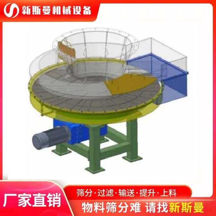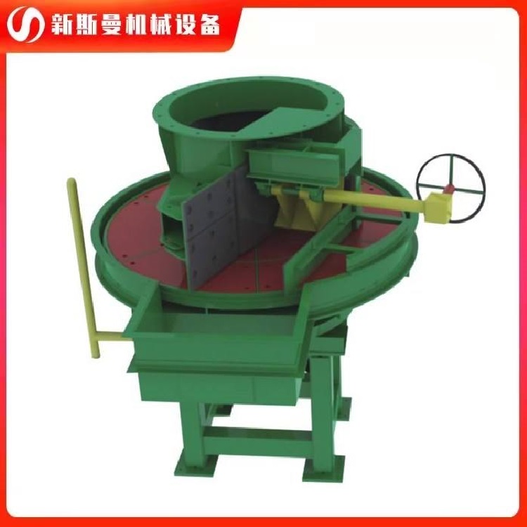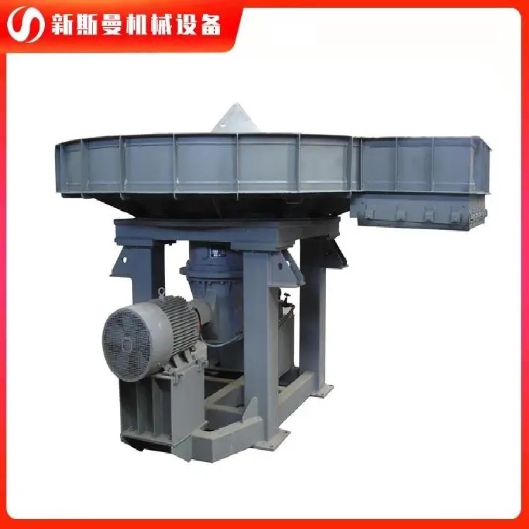 工作時,電動機通過減速機帶動圓盤轉動。圓盤轉動時,料倉內的物料隨著圓盤一起移動,并向出料口的一方移動,經閘門或刮刀排出物料。排出量的大小可用刮刀裝置或閘門來調節。圓盤給料機適用于20mm以下粉礦的給料設備,尤其針對河沙、石英砂、機制砂等砂類、顆粒類物料佳。