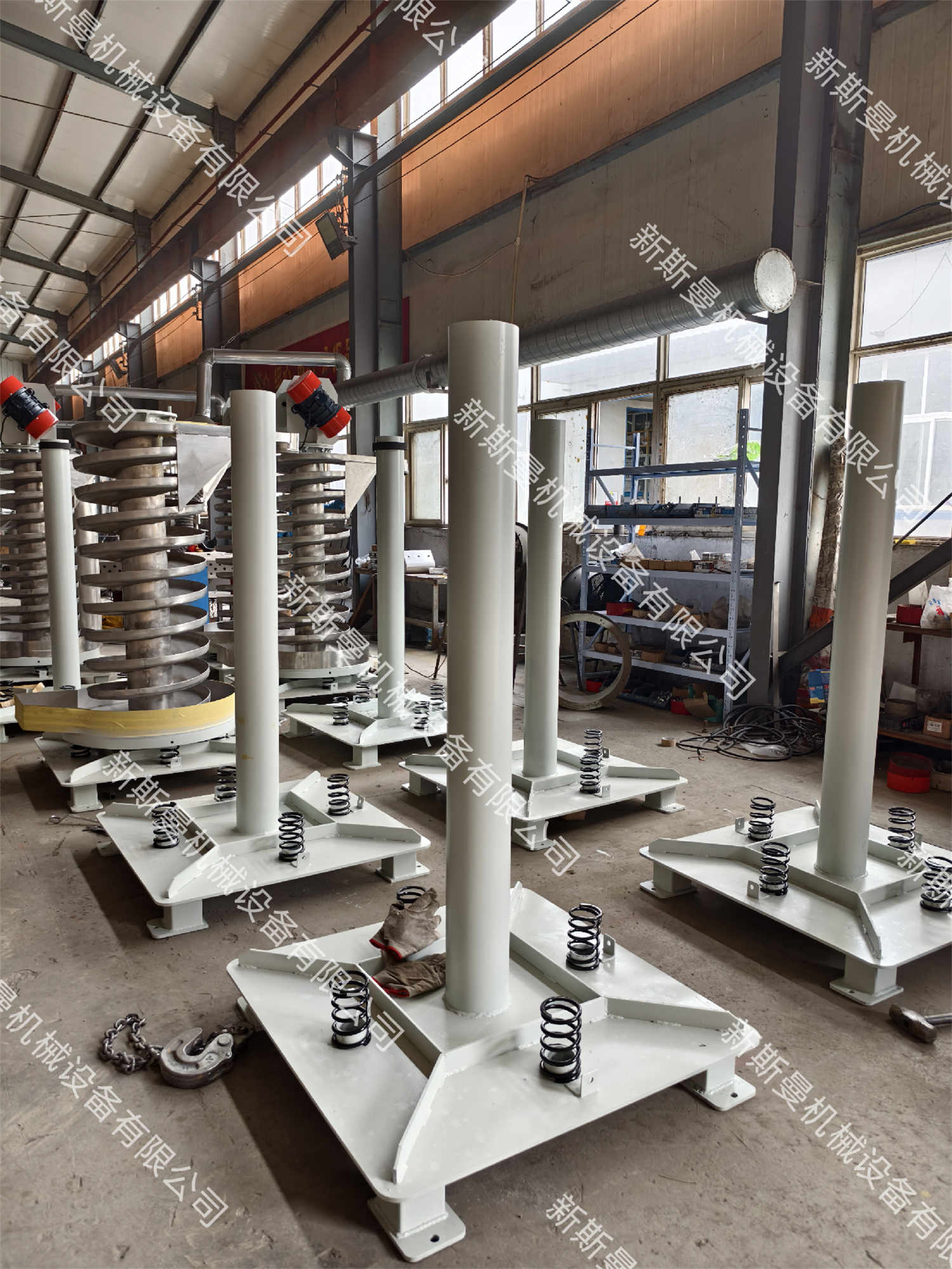 垂直提升機(jī)的驅(qū)動(dòng)裝置振動(dòng)電機(jī)安裝在輸送塔下部,兩臺(tái)振動(dòng)電機(jī)對(duì)稱交叉安裝,輸送塔由管體和焊接在管體周圍的螺旋輸送槽組成,輸送塔座于減振裝置上,減振裝置由底座和隔振彈簧組成。當(dāng)垂直提升機(jī)工作時(shí),根據(jù)雙振動(dòng)電機(jī)自同步原理,由振動(dòng)電機(jī)產(chǎn)生激振力,強(qiáng)迫整個(gè)輸送塔體作水平圓運(yùn)動(dòng)和向上垂直運(yùn)動(dòng)的空間復(fù)合振動(dòng),螺旋槽內(nèi)的物料則受輸送槽的作用,作勻速拋擲圓運(yùn)動(dòng),沿輸送槽體向上運(yùn)動(dòng),從而完成物料的向上(或向下)輸送作業(yè),因此本設(shè)備也被成為振動(dòng)垂直輸送機(jī)。