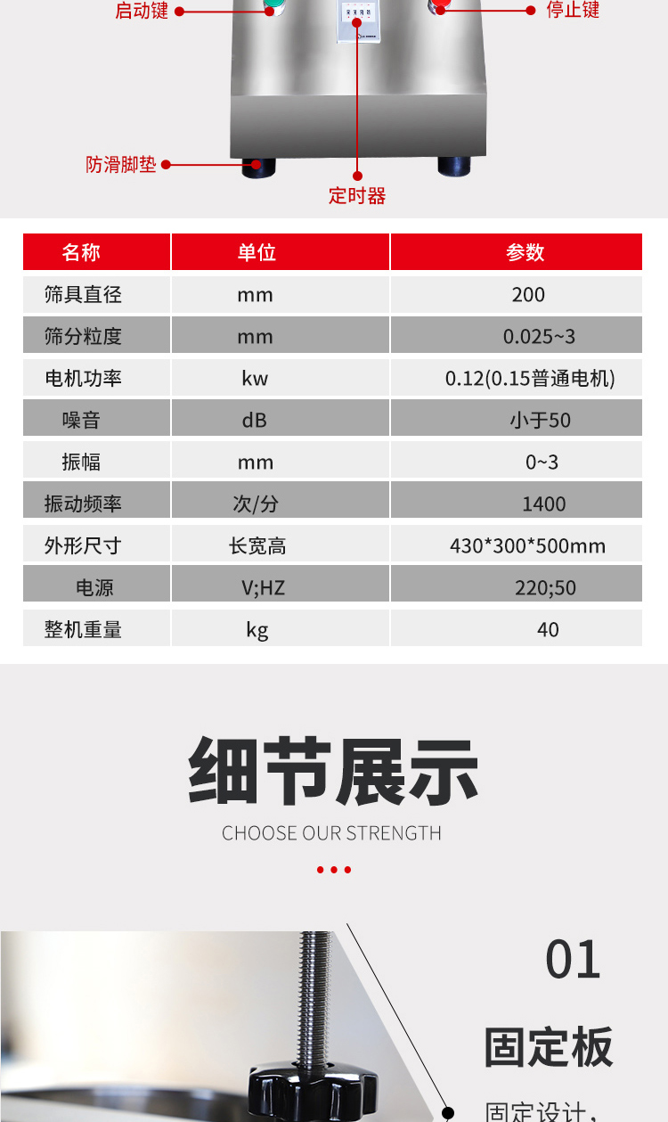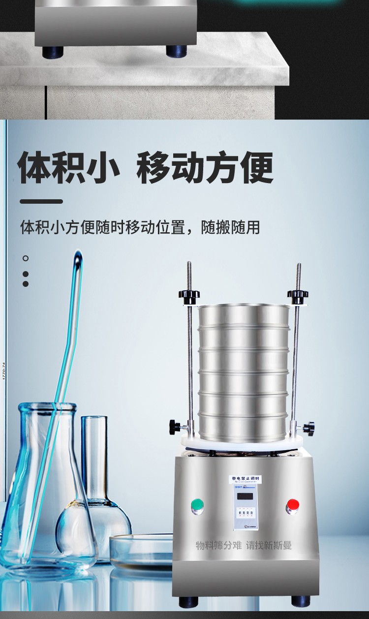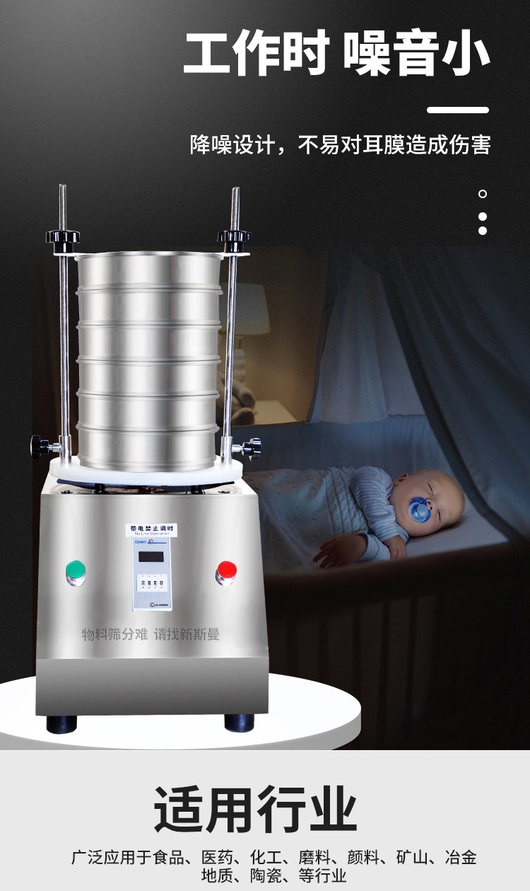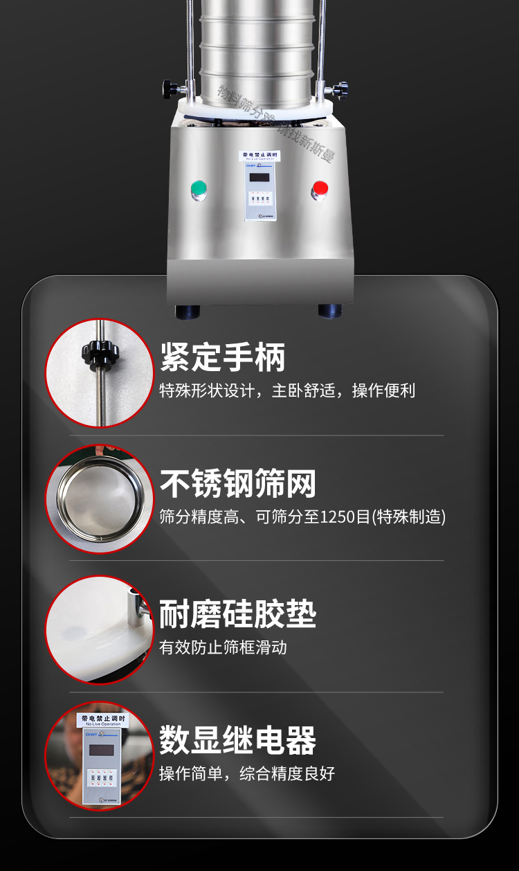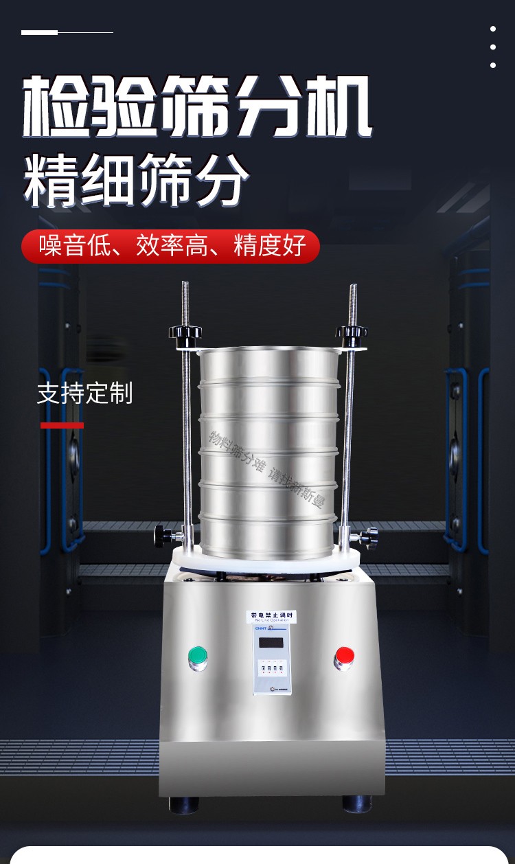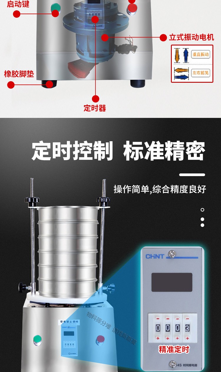 5. 根據(jù)物料性質(zhì)及投料量,在定時(shí)器上設(shè)定運(yùn)行時(shí)間,然后打開(kāi)電源開(kāi)關(guān),標(biāo)準(zhǔn)試驗(yàn)篩即開(kāi)始工作。