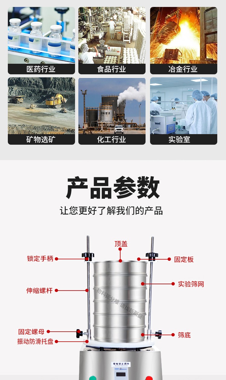 4. 把被檢驗(yàn)物料放入上端的標(biāo)準(zhǔn)篩框里,蓋上標(biāo)準(zhǔn)篩上蓋,根據(jù)標(biāo)準(zhǔn)篩框的總高度調(diào)整調(diào)節(jié)桿高度,然后用壓板和鎖緊螺母對(duì)標(biāo)準(zhǔn)篩框進(jìn)行定位壓緊(注:兩側(cè)要用力應(yīng)一致)。